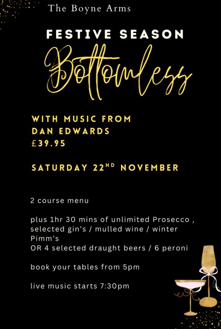 Saturday 22nd November: Festive Bottomless (from 5pm), Live Music from Dan Edwards (live music starts 7:30pm).